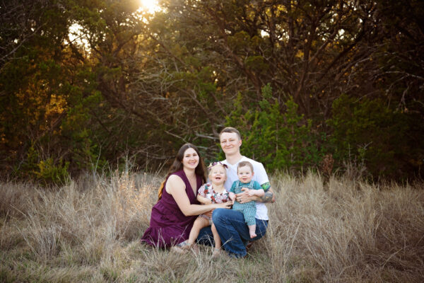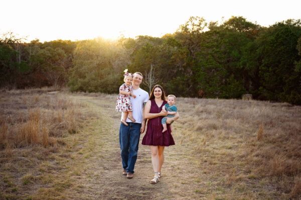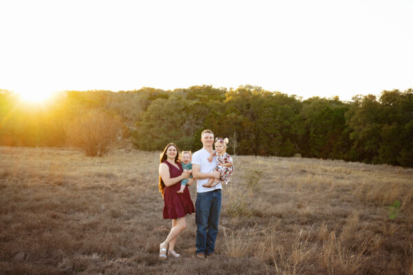 There is something so special about photographing a family year after year and watching their story unfold. This beautiful family of four met me in a dreamy open field in Helotes, Texas just outside of San Antonio, and it could not have been a more perfect evening. The tall golden grass swayed gently in the breeze while the Texas sunset wrapped everything in that soft, glowing light we all love.